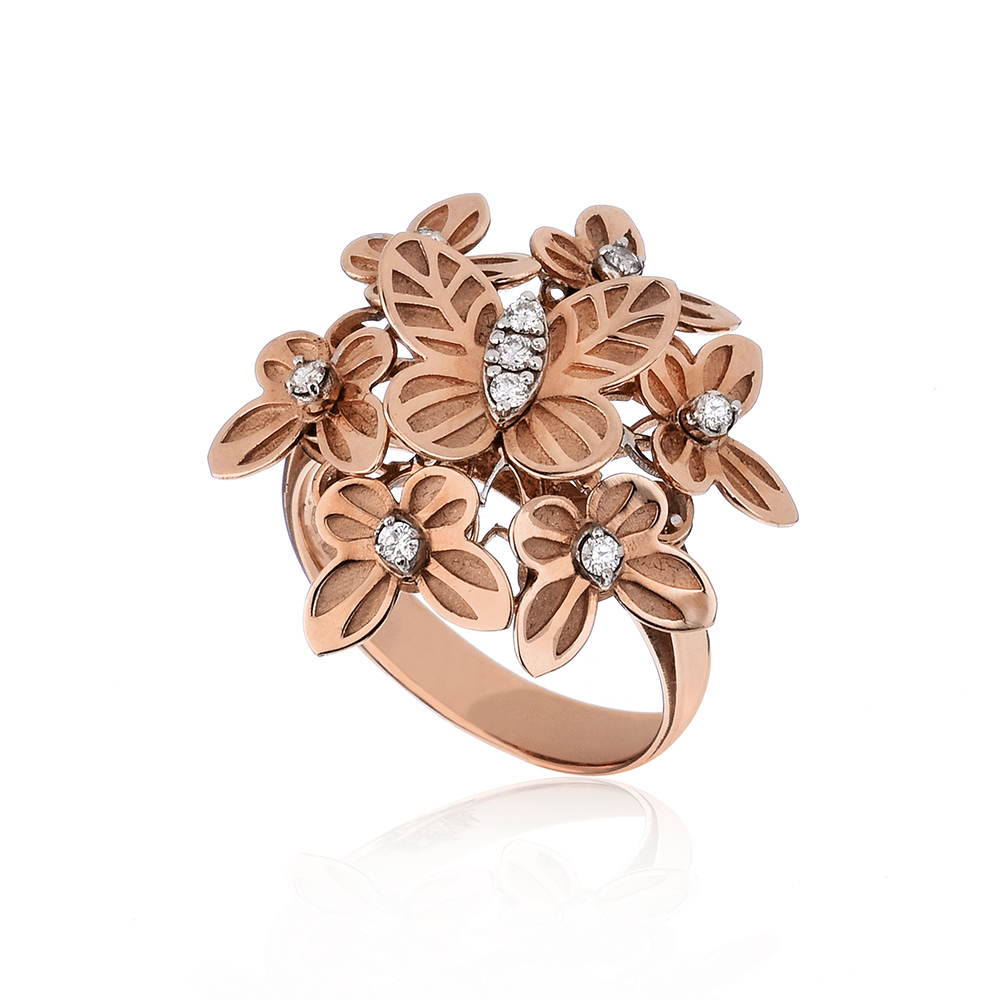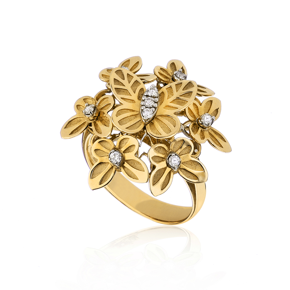 Una farfalla centrale circondata da farfalle più piccole che danzano su loro stesse creando un gioco di movimento e dinamismo. I corpi, delineati da luminosi diamanti, e le ali finemente lavorate conferiscono un’eleganza straordinaria all’anello.