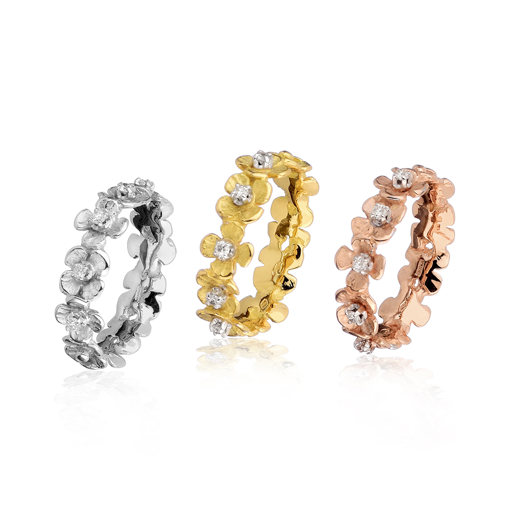 I fiorellini si susseguono in una sequenza continua donando all’anello un aspetto fluido e armonioso. Al centro dei fiori della parte superiore brillano diamanti scintillanti per un tocco di lusso e luminosità, nella parte inferiore invece i pistilli in oro giallo creano un contrasto delicato e armonioso.