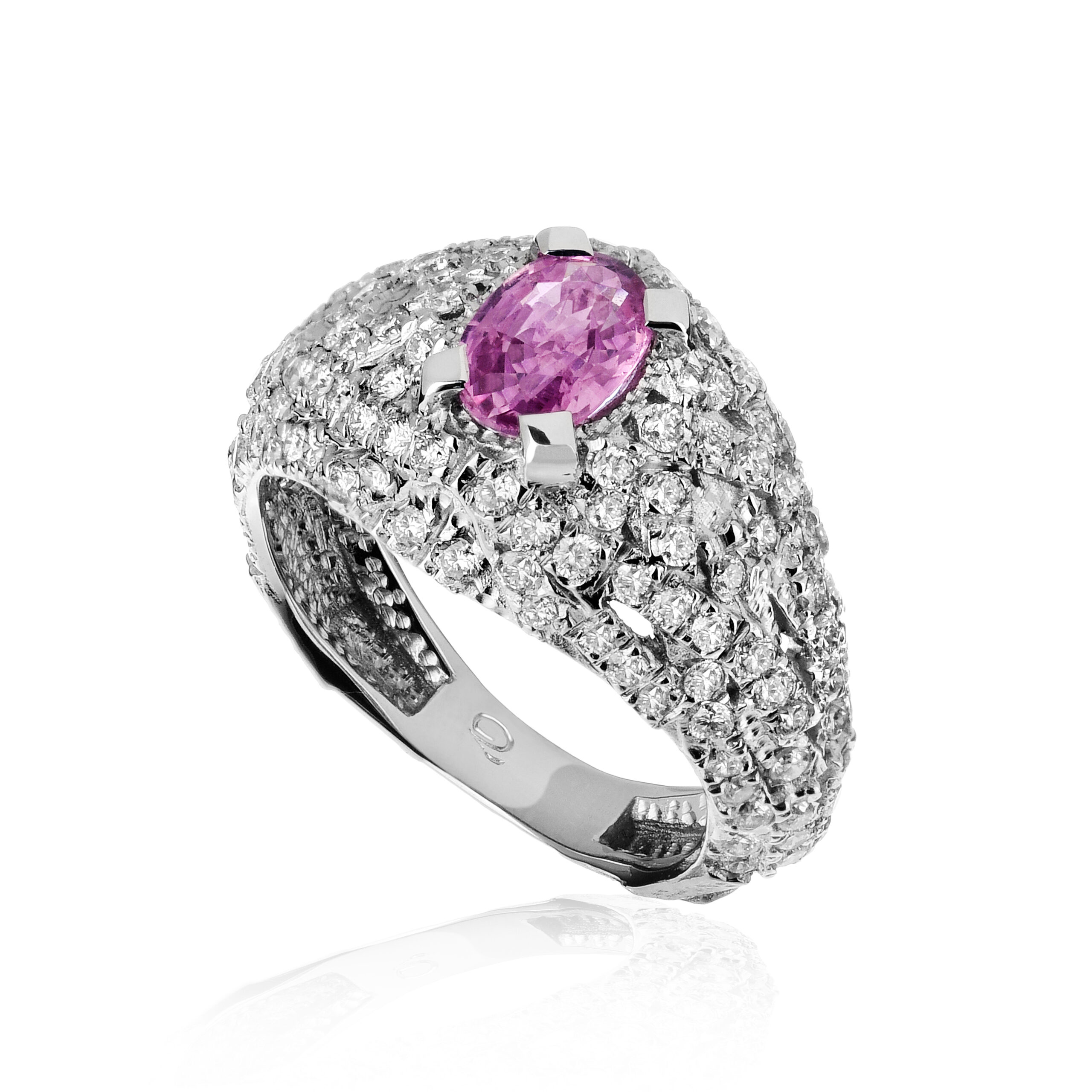 La base, costituita da barrette in oro satinato con dettagli lucidi che si incastrano tra loro in modo impeccabile, aggiunge un tocco di originalità alla sua eleganza intramontabile. I diamanti, incassati con precisione su ciascuna barretta, creano un magnifico gioco di luce che mette in risalto lo zaffiro rosa centrale.