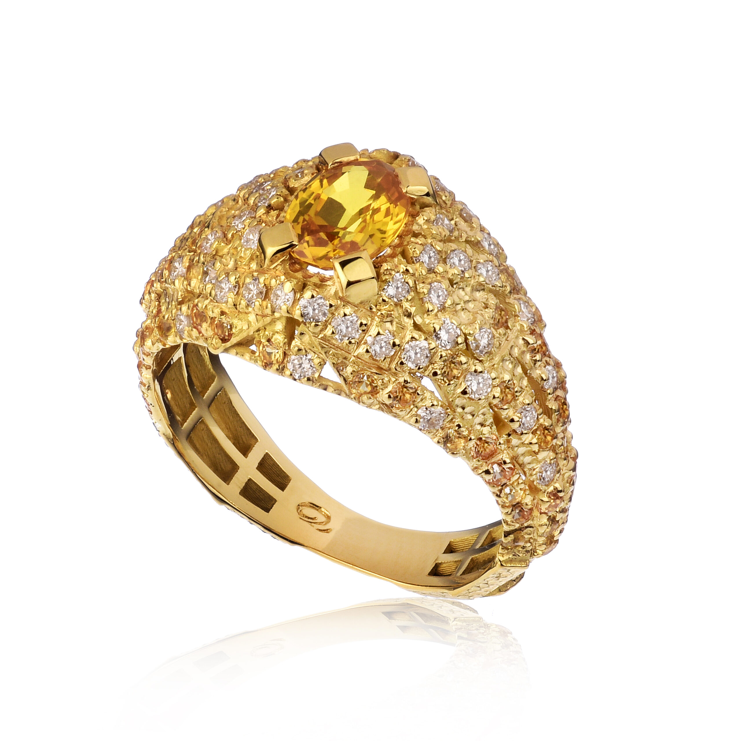 Anello in oro giallo titolo 750‰ con diamanti naturali taglio brillante e zaffiri gialli.