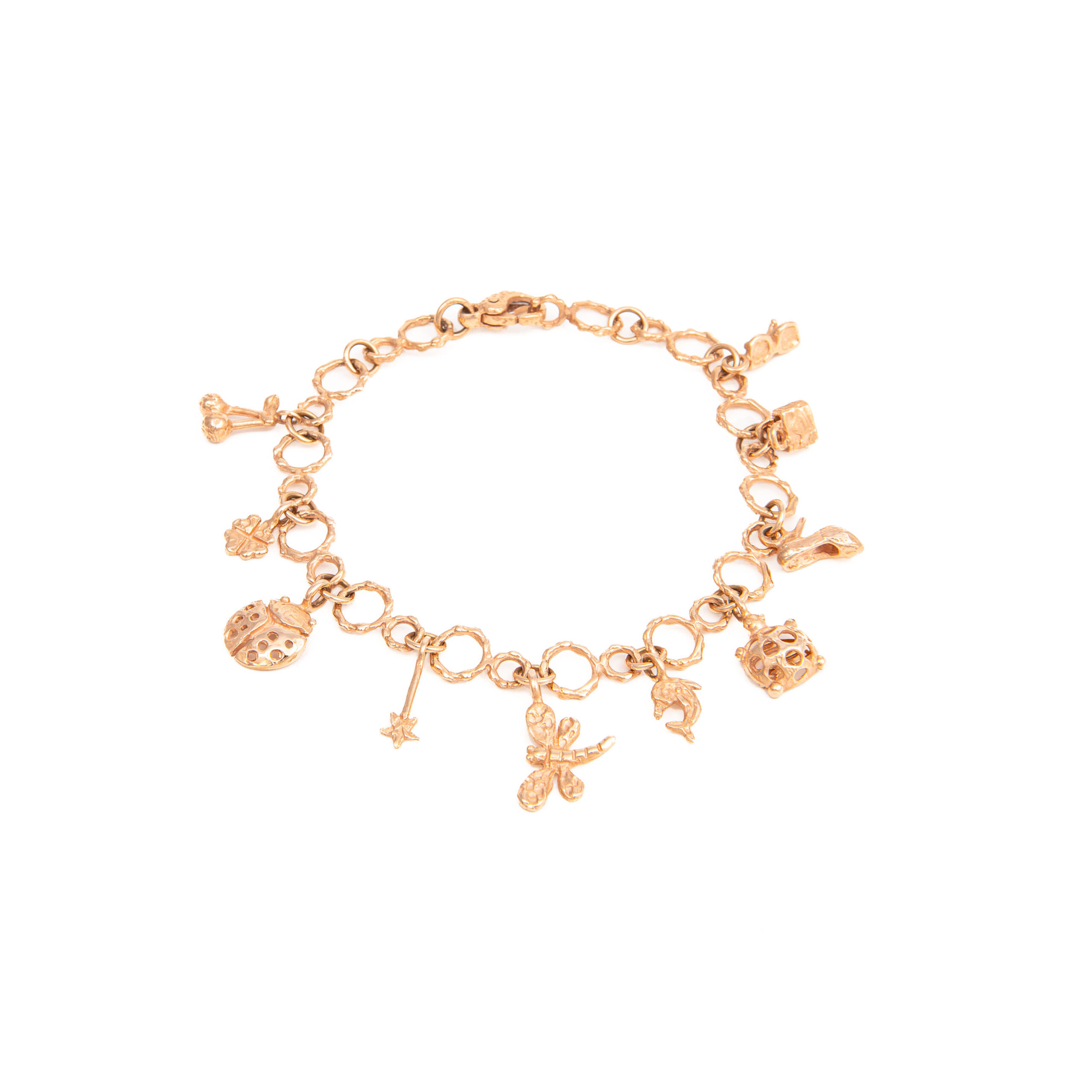 Dalla base, formata da cerchi di varie dimensioni, pendono graziosi charms finemente lavorati aggiungendo un tocco di giocosa eleganza al bracciale.