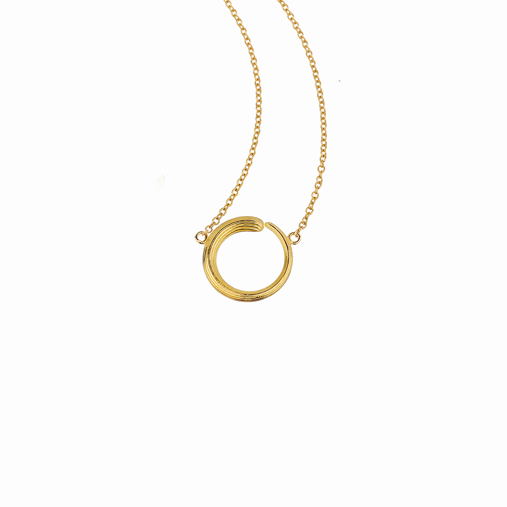 La catena rolo’ avvolge delicatamente il collo, al centro un elegante cerchio a scalare in cui la parte superiore inizia delicatamente sottile e si sviluppa gradualmente in una sezione più spessa, finemente lavorata con raffinate striature per un aspetto dinamico e sofisticato.