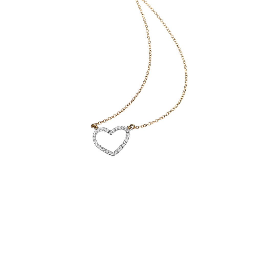 La catena rolo’ in oro giallo avvolge il collo con eleganza, culminando nel cuore centrale in oro bianco e diamanti.