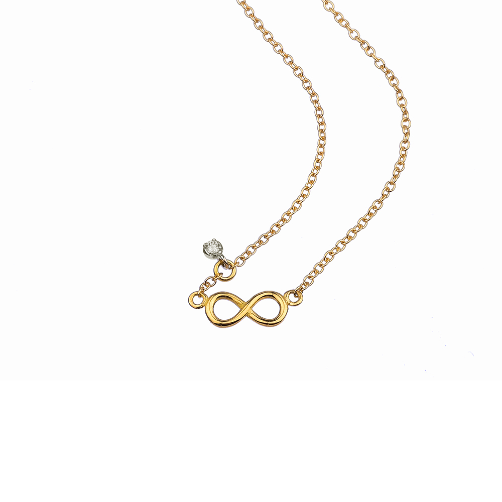 La catena rolo’ avvolge delicatamente il collo, mentre al centro risplende l’infinito in oro lucido con accanto un piccolo diamante pendente con montatura in oro bianco che aggiunge lucentezza. L’unione del significato simbolico dell’infinito con l’eleganza classica dell’oro per un gioiello di raffinata bellezza.