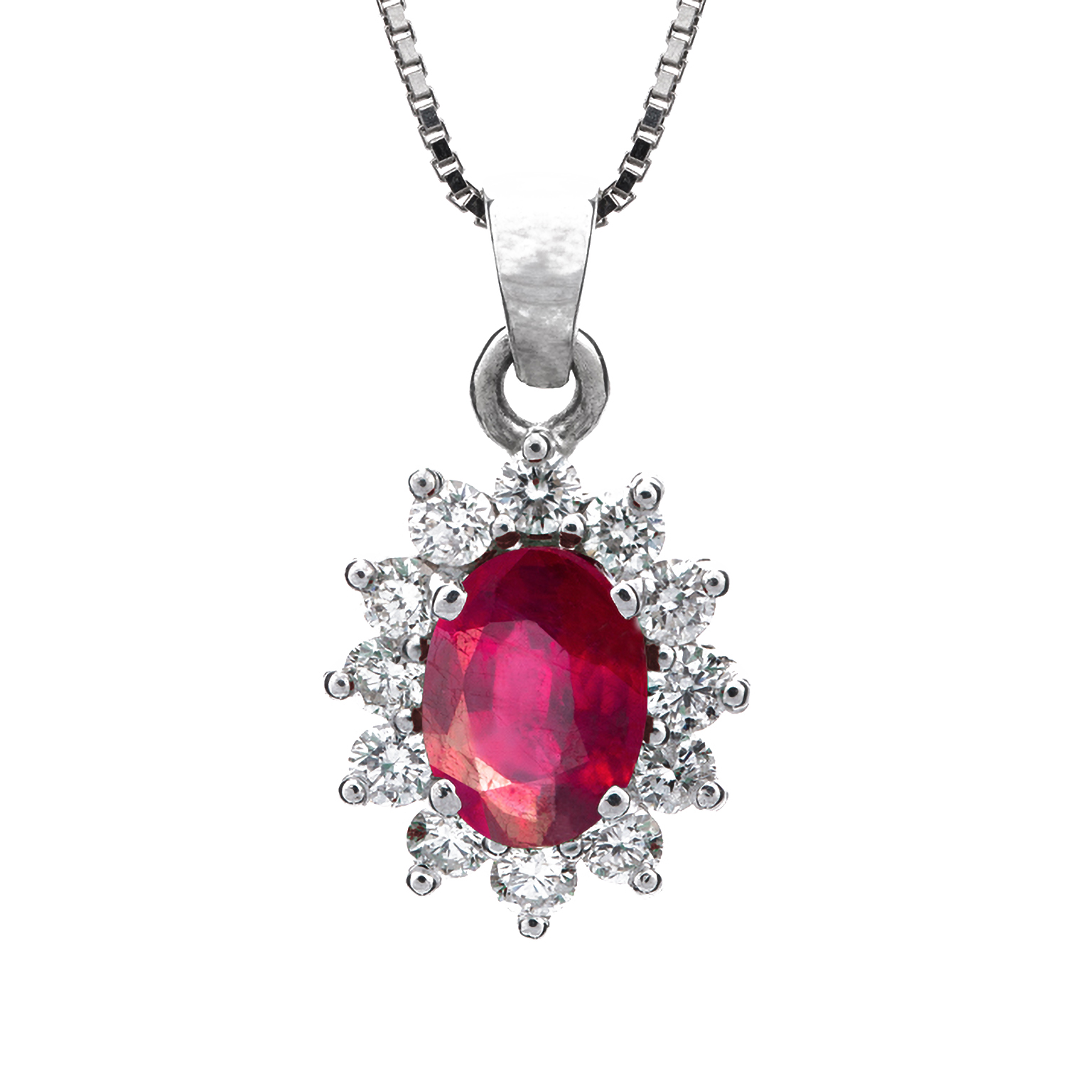 Materiale: Oro bianco – Diamanti – Rubino Lunghezza in cm: 42 Carati pietre: Diamanti naturali taglio brillante 0,36 – Rubino 1,04