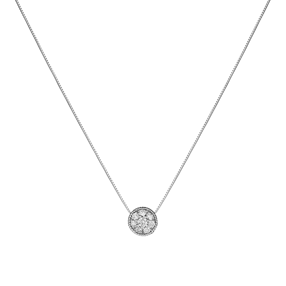 La montatura tonda zigrinata impreziosita da una corona di diamanti per un pendente ricercato ed elegante.
