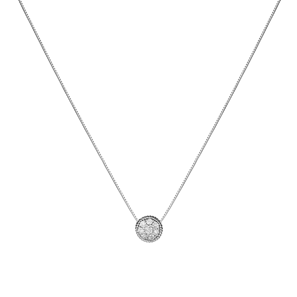 La montatura tonda zigrinata impreziosita da una corona di diamanti per un pendente ricercato ed elegante.