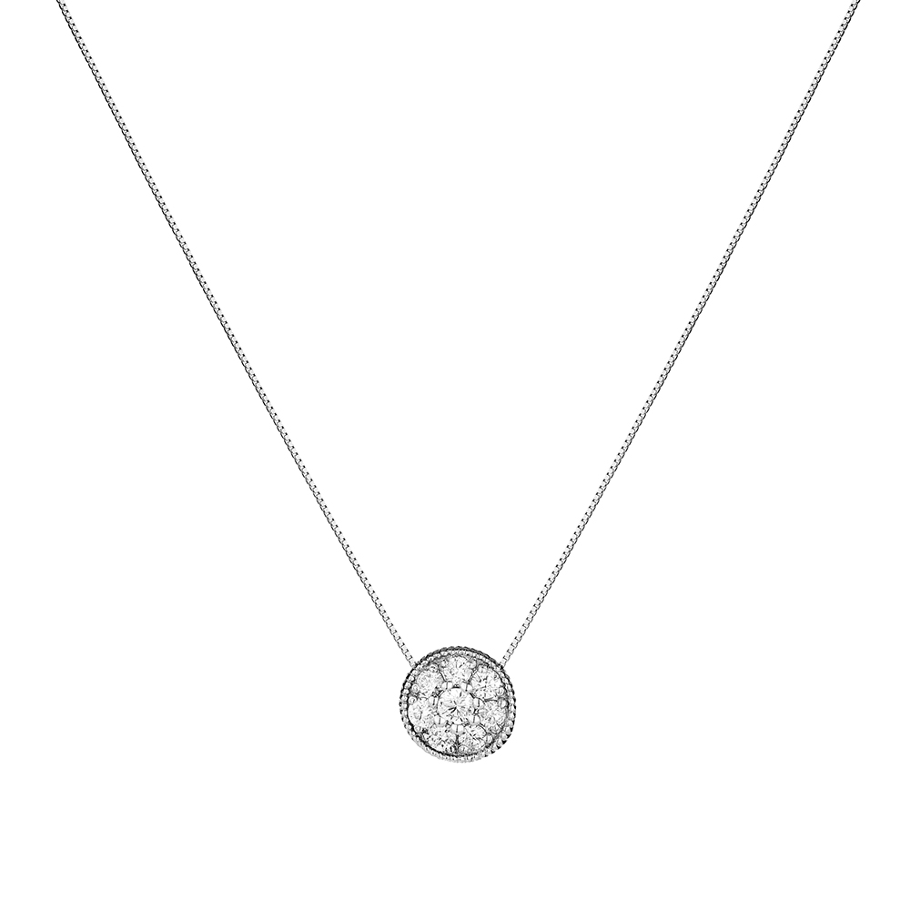 La montatura tonda zigrinata impreziosita da una corona di diamanti per un pendente ricercato ed elegante.