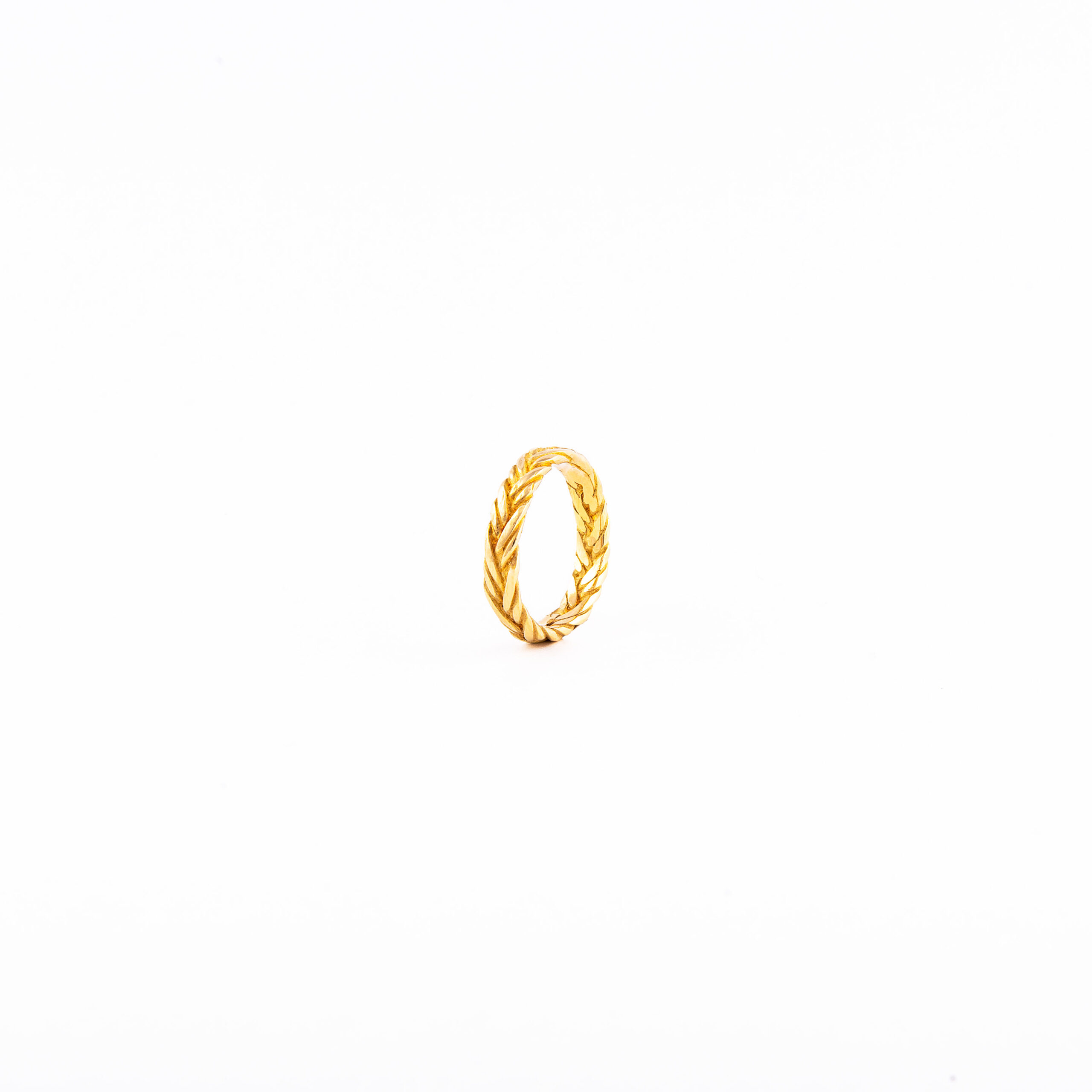 Fede piatta in oro giallo satinato, caratterizzata da un intreccio in oro lucido che si estende lungo l’intera circonferenza.